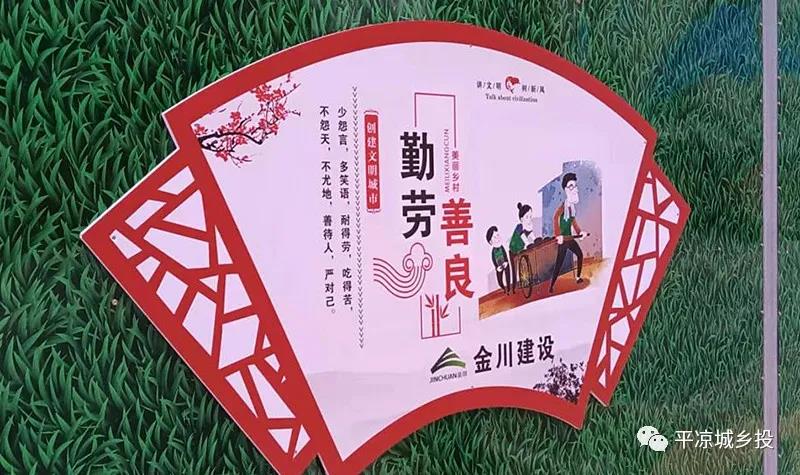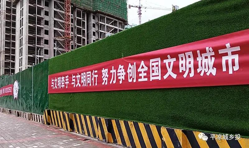 为了让工地围挡成为城市文明的一道风景线,房产公司用公益广告及绿草皮扮靓建筑围挡,并在项目现场悬挂多条宣传横幅。从社会主义核心价值观到创建文明城市,以内容丰富的公益广告为城市文明增色添彩。