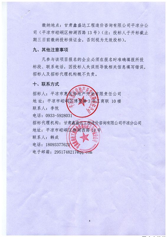 2.投标文件递交地点为:平凉市崆峒区博爱路3号工商联大厦11楼(平凉市惠民房地产开发有限责任公司会议室)。