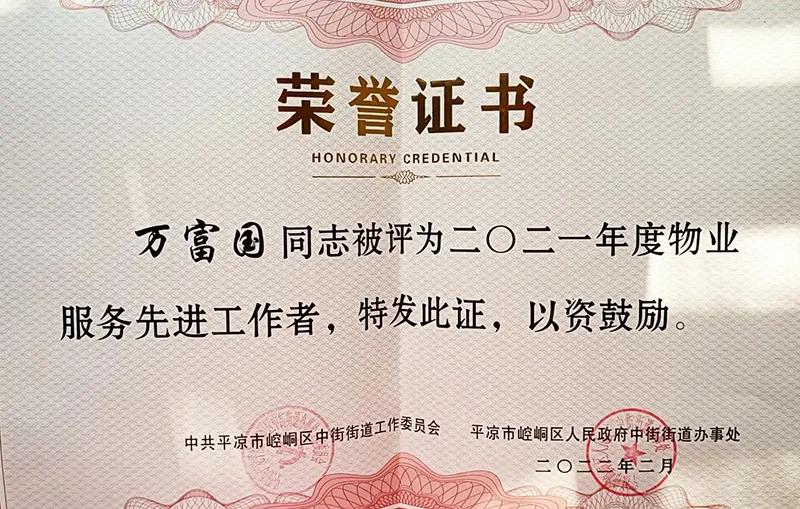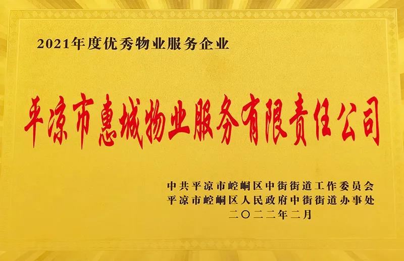 2月11日,平凉市崆峒区中街街道召开2022年度物业管理工作大会,惠城物业公司被评为“2021年度优秀物业服务企业”,新北嘉园物业服务中心保安员万富国同志荣获“物业服务先进工作者”。此次荣誉的获得,是社区和全体业主对物业服务、小区环境、文明氛围的认可,更是对新北嘉园物业中心员工工作的肯定。