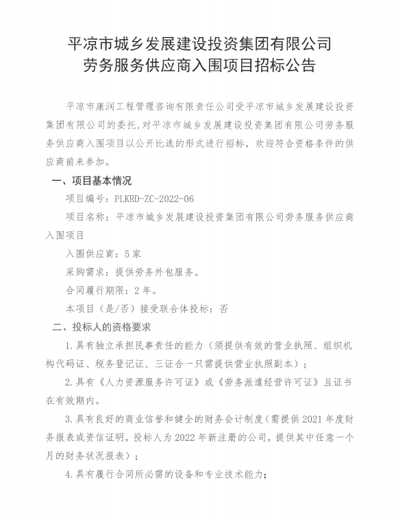 劳务服务供应商入围项目招标公告